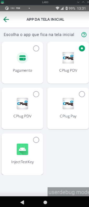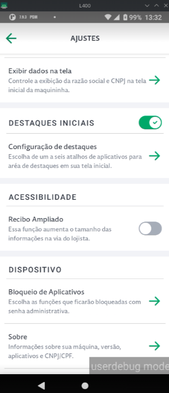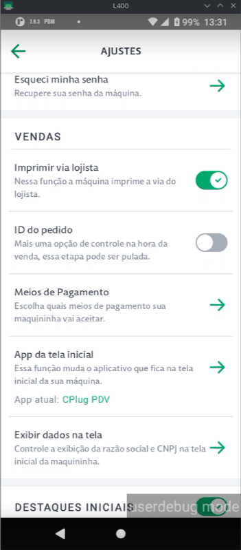 Observação: Para inicializar automaticamente o app do totem na POS MÓVEL, Clique em ajustes // Navegue ate App da tela inicial dentro de vendas // Selecione o app desejado // Recomendado, desmarque Destaques Iniciais.