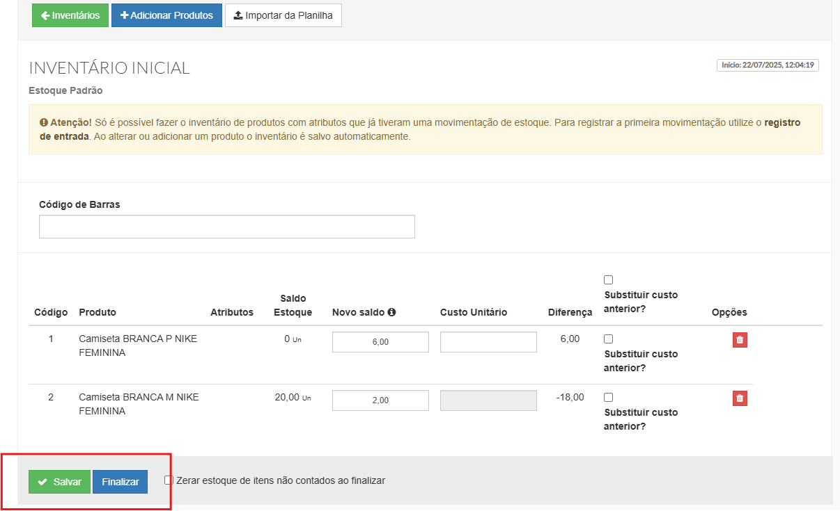Se o nome do inventário não for inserido, ele será criado com a data e a hora atuais, o que pode servir como identificador no ERP.