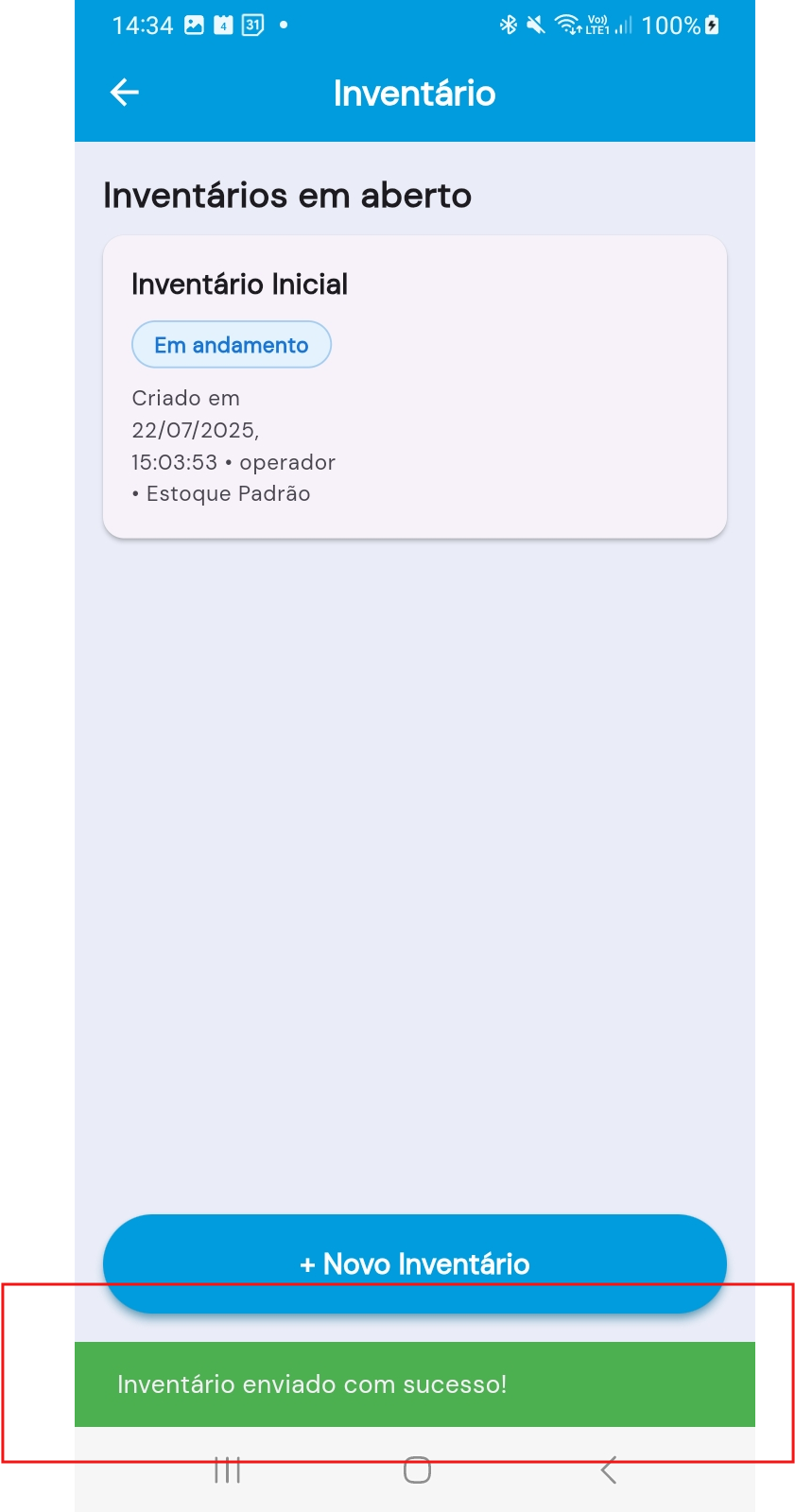 - O inventário permanece aberto no aplicativo após o envio, permitindo que mais itens sejam adicionados posteriormente, se necessário.