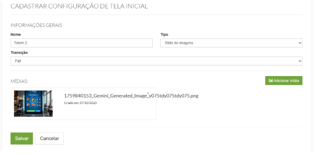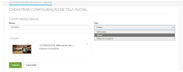 1. Crie a Configuração da Tela Inicial: Acesse Configurações Gerais > Configurações do Totem > Configurações de Tela Inicial.
