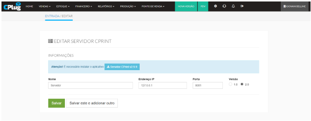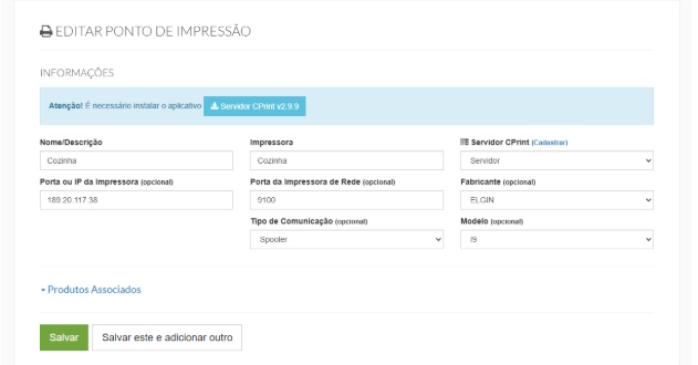-> Acesse no ERP>Configurações do PDV>Servidores CPRINT>Novo Servidor CPRINT: