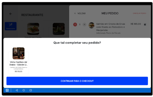 Ao clicar para finalizar, uma tela pop-up aparece (ex: "Que tal completar seu pedido?") exibindo o item de UpSell (ex: Batata Frita ou Refrigerante).