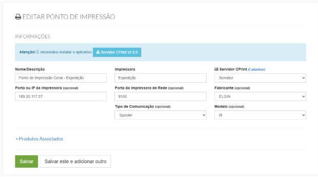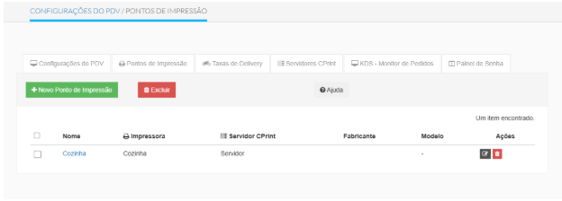 -> Após a configuração do CPRINT, acesse no ERP>Configurações do PDV>Pontos de Impressão: