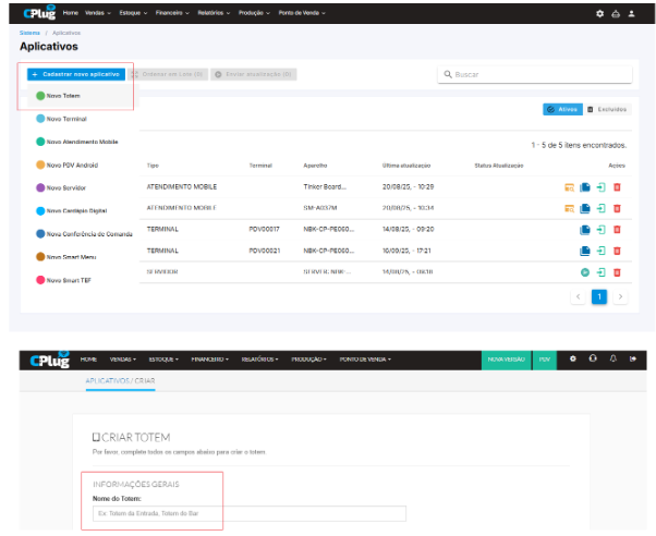 - Acesse o ERP da CPLUG e crie um NOVO TOTEM em Pontos de Venda > Aplicativos > Cadastrar novo aplicativo.
