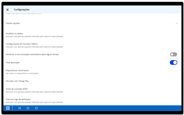 Função: Deixa o aplicativo Totem fixado, impedindo que o operador ou cliente acesse outros aplicativos ou configurações do dispositivo. Importância: Garante que o dispositivo funcione puramente como totem. |