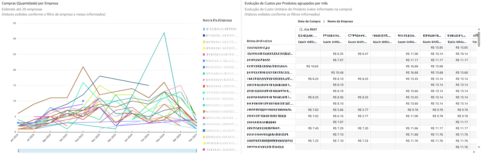 Apresenta o valor total de compras realizadas com cada fornecedor em cada mês. Permite uma análise detalhada dos padrões de compra ao longo do tempo e o monitoramento do desempenho dos fornecedores.