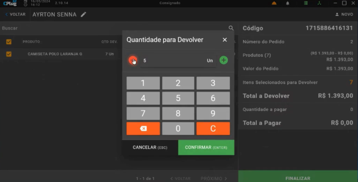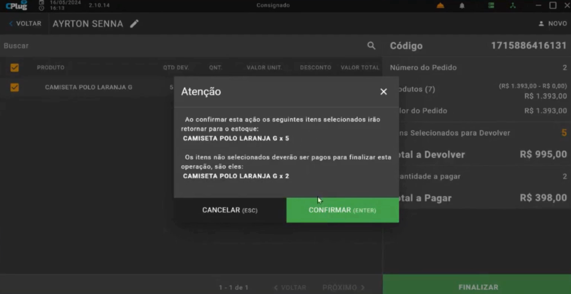 Após selecionar o cliente, o operador confirma a operação.
