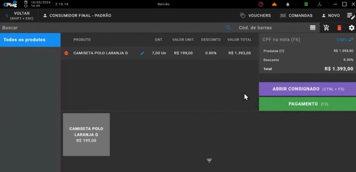 Durante o processo de venda, o operador tem a opção de abrir uma venda consignada clicando em um botão designado para essa função.