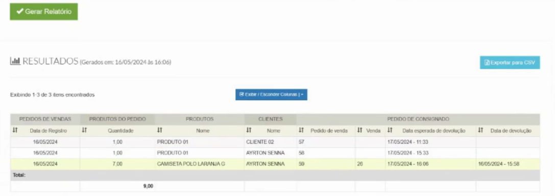 A partir deste relatório, você pode criar um relatório personalizado com filtros específicos para os pedidos em consignação, fornecendo informações detalhadas conforme suas necessidades. Isso significa que você pode selecionar critérios como datas, clientes ou tipos de produtos para obter uma visão mais precisa das vendas consignadas.