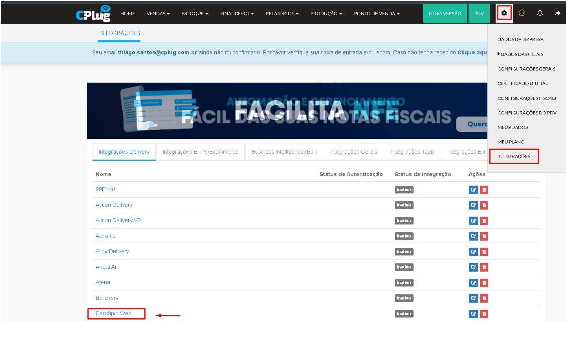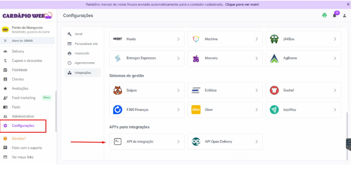 3. Seleção da Integração: Selecione a opção Cardápio Web dentro do menu de Integrações.