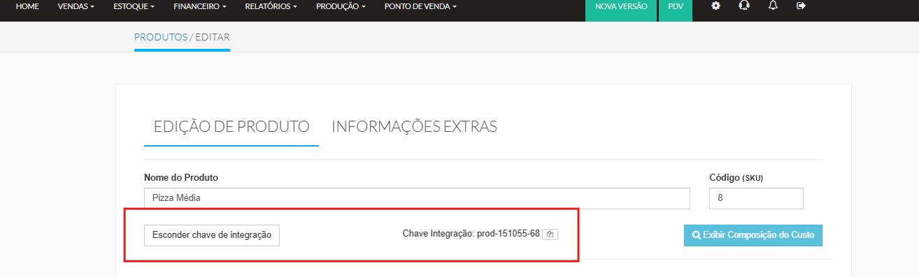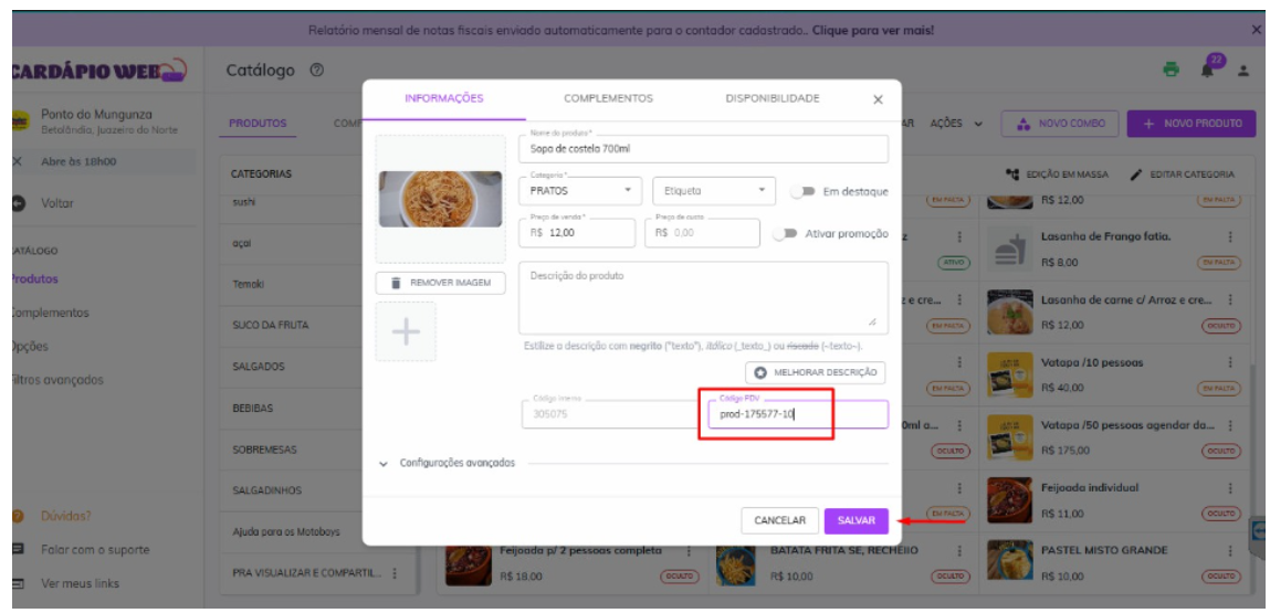 5. Vínculo de Produtos (Itens): Após ativar a integração, é necessário realizar o vínculo dos produtos. Para isso, associe os códigos de integração correspondentes entre os produtos cadastrados na CPlug e os produtos que existem no Cardápio Web.