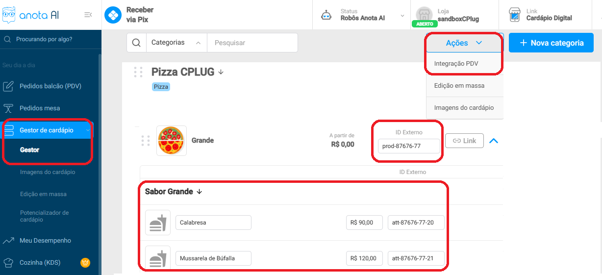 Localize o respectivo item no gestor de cardápios, clique em AÇÕES>INTEGRAÇÃO PDV