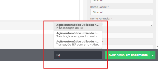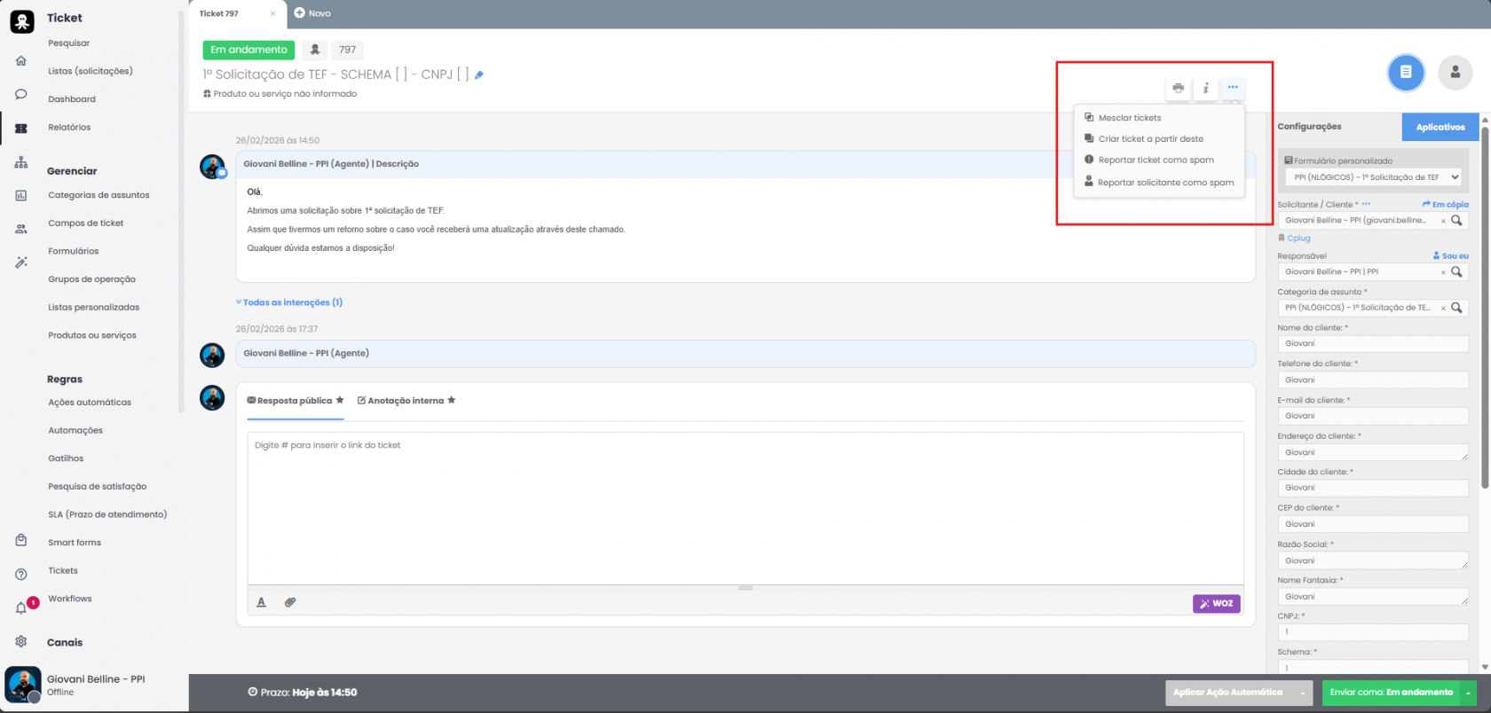 - No ticket recém-criado, localize o campo "Aplicar ações automáticas".