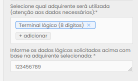 - Lógica de Adquirentes (Ex: Getnet): Ao encontrar o botão "+ Adicionar", selecione a adquirente. IMPORTANTE: Após selecionar (ex: Getnet), você deve clicar manualmente nos campos exibidos (como "Código do Estabelecimento" e "Terminal Lógico") para que as caixas de texto de preenchimento apareçam no formulário.