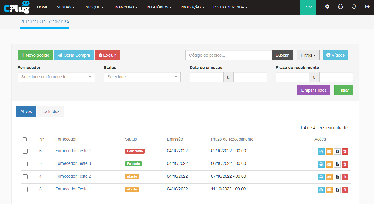 Com este módulo é possivel criar e gerir Pedidos de Compra, realizar envio por email a seus Fornecedores, gerar arquivo em PDF e converter posteriormente em Compras (a gestão da Compra será feita no Módulo de Compras)
