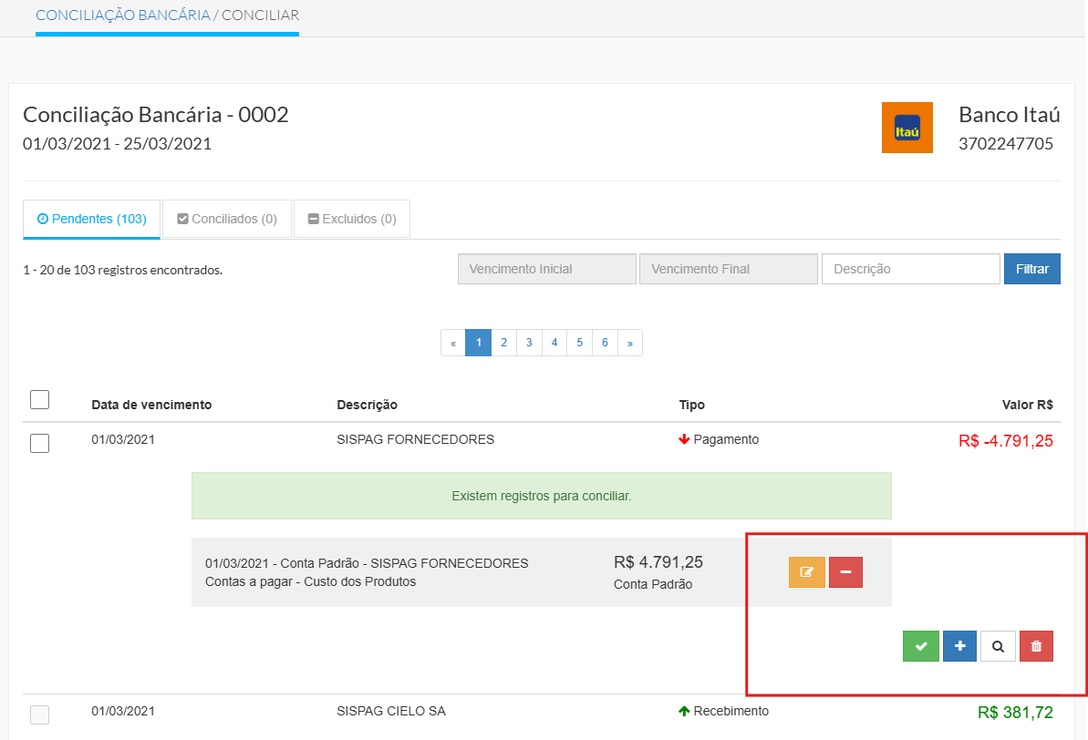 ◦ Na aba "Pendentes", o sistema listará as transações do extrato que ainda não foram conciliadas.