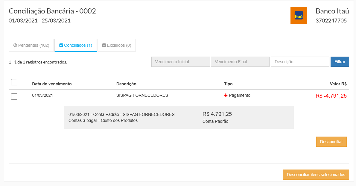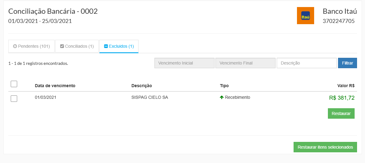 ◦ Ao finalizar o vínculo e o registro dos itens, o registro no Contas a Receber ganhará o status "Conciliado".