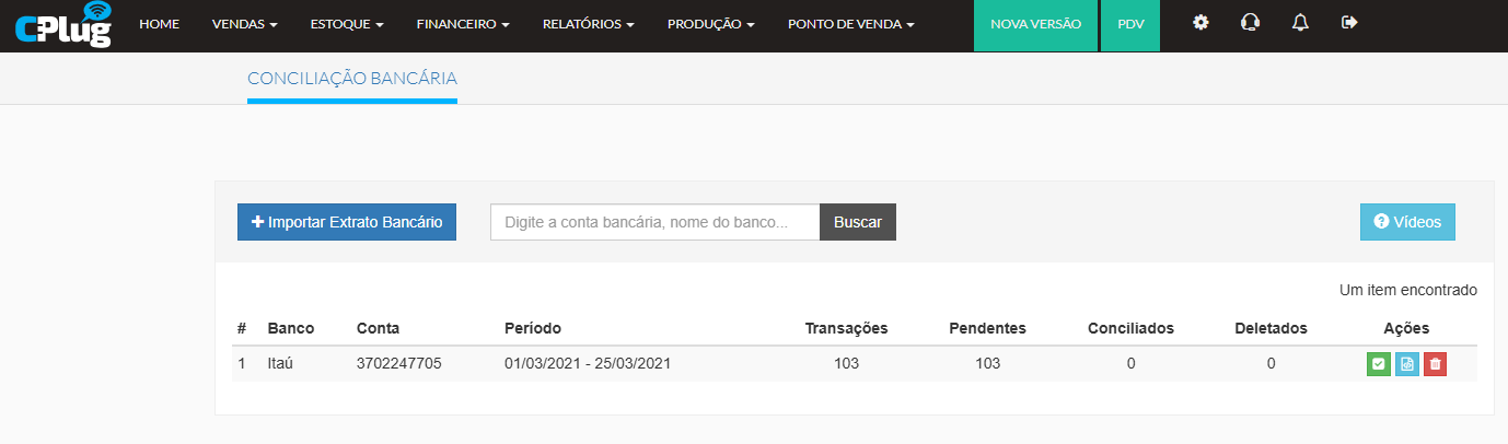 ◦ Localize o extrato importado e escolha a opção de Conciliar ao lado direito da tela.