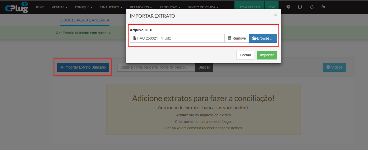 ◦ Selecione o arquivo de extrato em formato OFX e realize a importação.