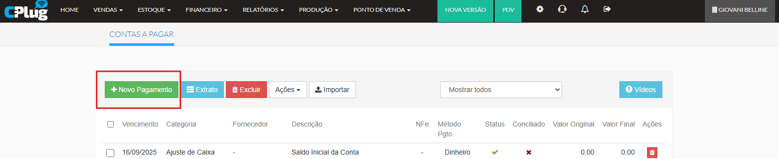 2. Clique no botão ‘+ Novo Pagamento’ no canto superior da tela.