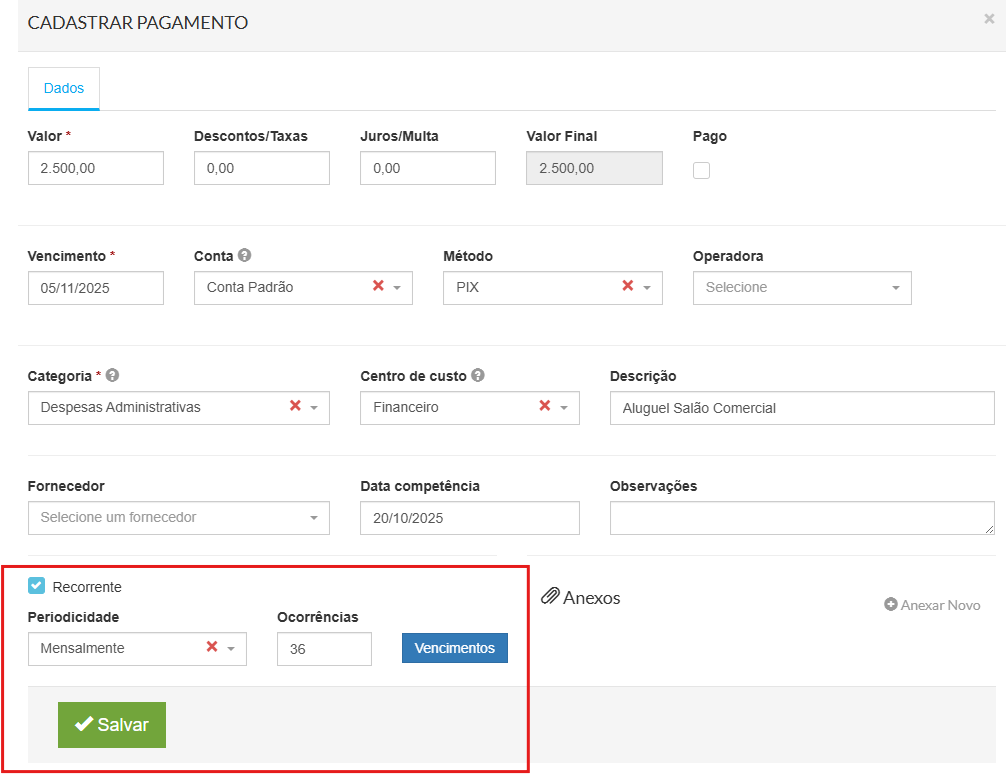 Observação importante: Ao selecionar recorrência e especificar o número de ocorrências o sistema não fará o parcelamento do respectivo valor, ele fará a repetição do valor de acordo com número de ocorrências. Exemplo: Uma conta a pagar de R$2.000,00, se for especificado a ocorrência de 36 vezes, serão criados 36 pagamentos de R$2.000,00.