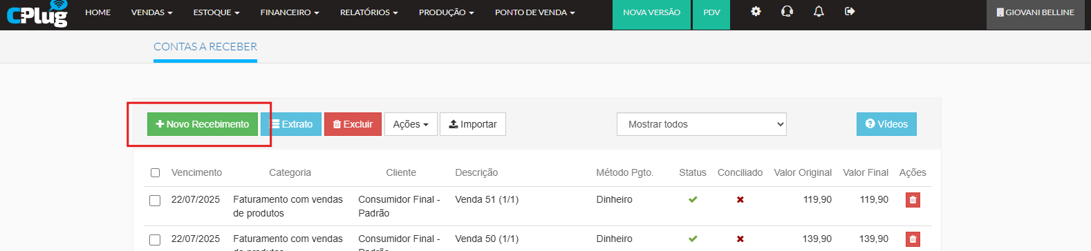 2. Clique no botão ‘+ Novo Recebimento’ no canto superior da tela.