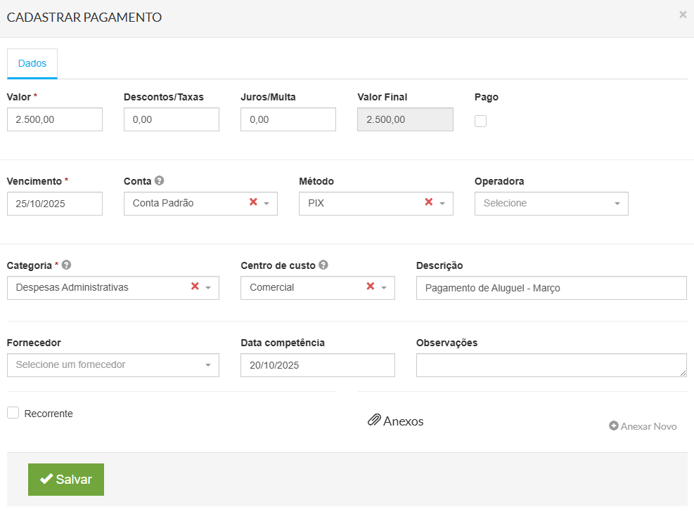 Os campos abaixo são utilizados para registrar todas as movimentações financeiras (pagamentos ou recebimentos) no sistema, sejam elas manuais, fixas ou recorrentes: