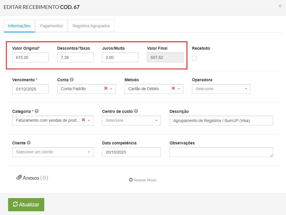 A conexão direta com o módulo Contrato de Cartões (Módulo Pago) é fundamental para quem realiza vendas com cartão. Ao configurar as taxas cobradas pelas adquirentes neste módulo, elas são refletidas automaticamente nos lançamentos do Contas a Receber. Isso permite que o gestor visualize duas colunas cruciais: o "Valor Original" da venda e o "Valor Final", que é o montante líquido que efetivamente entrará na conta após o desconto das taxas. Essa transparência é essencial para entender os custos reais das transações e a rentabilidade do negócio.