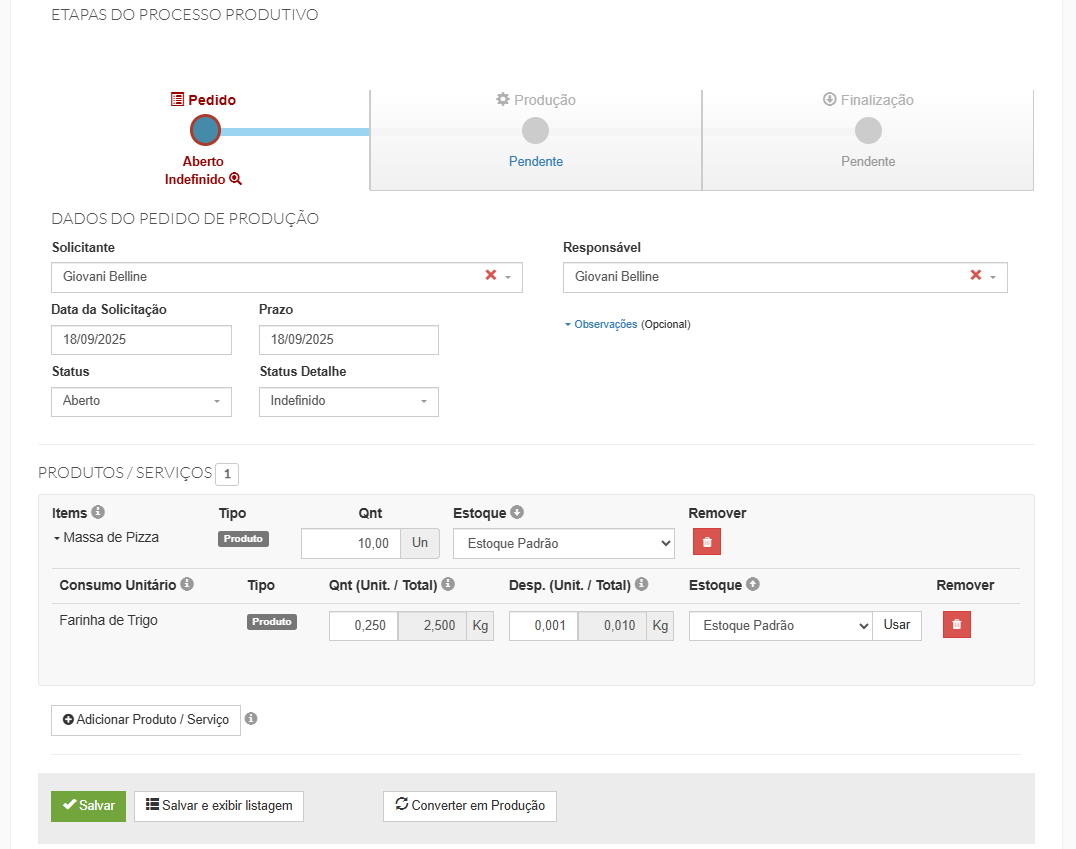 Informe a quantidade: Defina a quantidade de unidades do produto final que você irá produzir. O sistema é inteligente: ele usará as informações da ficha técnica para calcular automaticamente a quantidade de insumos que serão necessários.