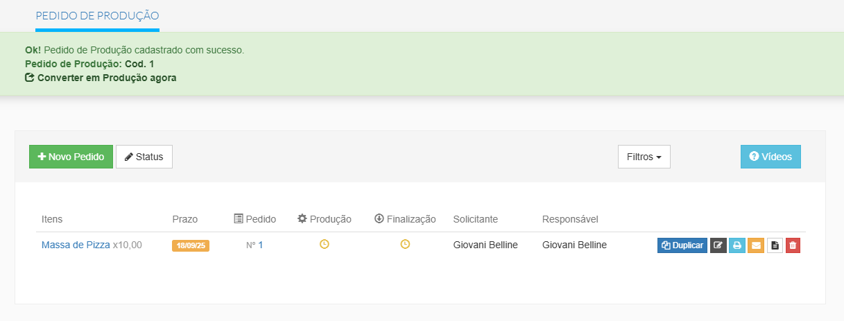 - Esta ação iniciará o processo para registrar o pedido, ou ordem de produção.