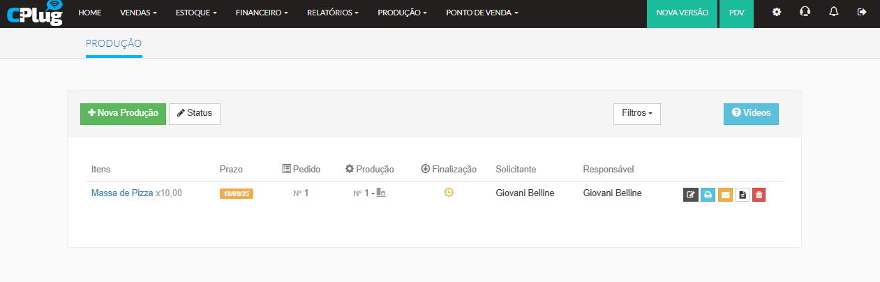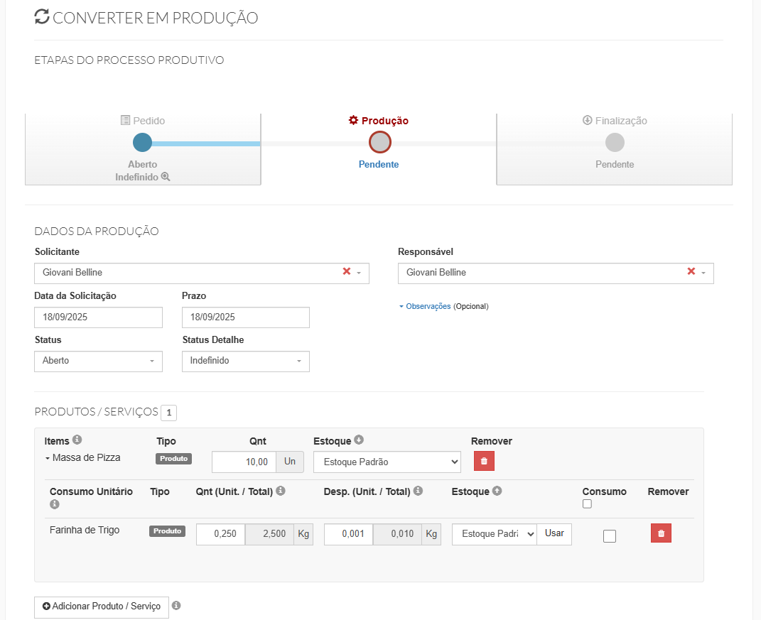 Exemplo: No caso da produção das 10 Massas de Pizza, assim que finalizado a etapa de Produção, será dado a entrada no estoque das 10 Massas de Pizza. Os estoques dos insumos (farinha de trigo e demais insumos) terão uma baixa correspondente à quantidade utilizada.