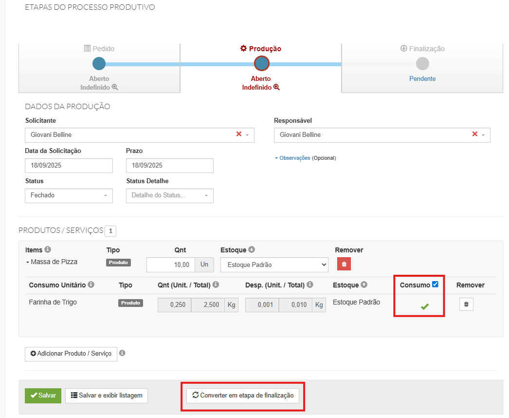 Para finalizar a Produção e os insumos serem corretamente consumidos, certifique-se de marcar Consumo nos respectivos Produtos e Insumos e selecionar Converter em Etapa de Finalização.