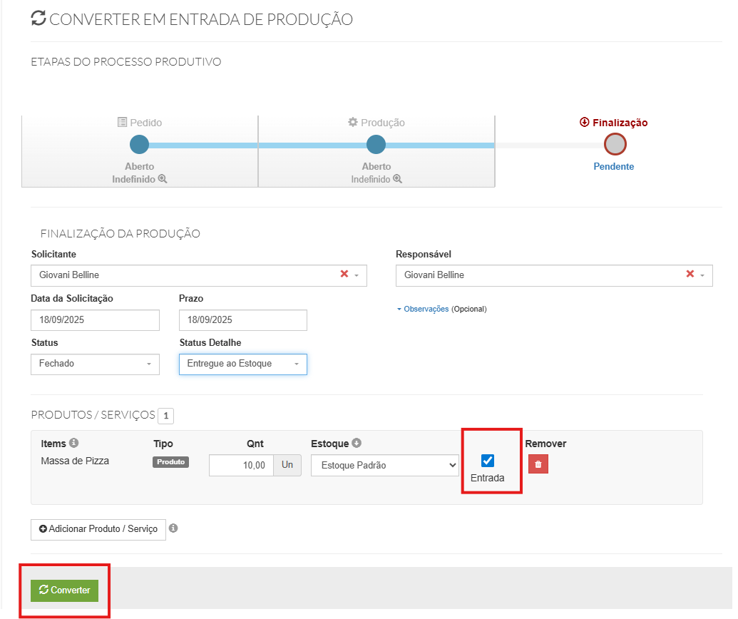 Como etapa final, o produto do tipo Processo Produtivo, precisa ser inserido no Estoque, para isso é obrigatório a marcação de Entrada e selecionar a opção Converter.