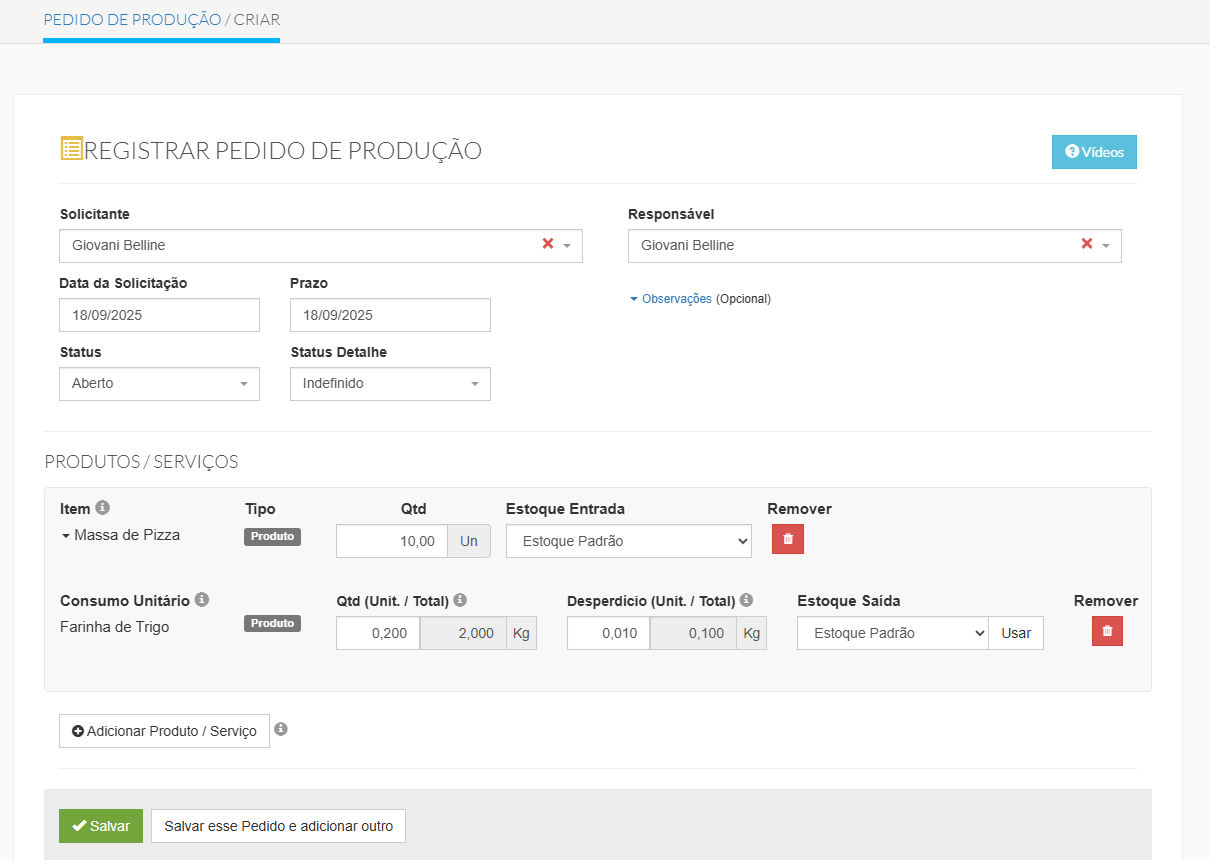 Exemplo: Se a ficha técnica de uma Massa de Pizza exige 200g de faria de trigo, ao informar que você irá produzir 10 massas de pizza, o sistema entenderá que precisará de 2kg farinha de trigo