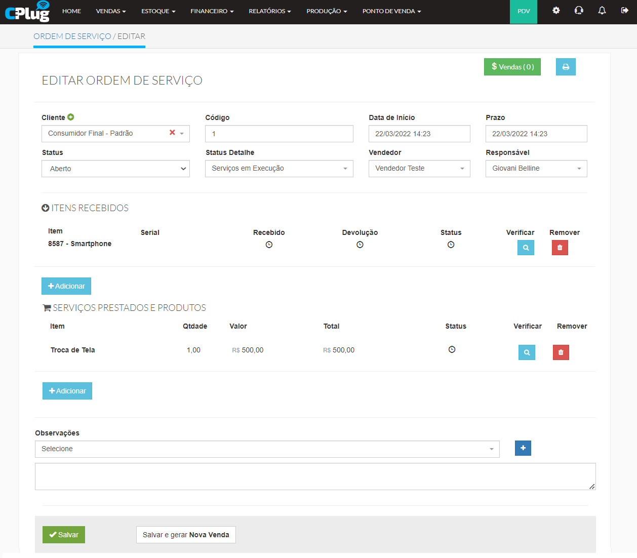- De acordo com o valor de venda do serviço e/ou produto relacionado o sistema trará o valor, mas ainda será possível editar o valor à ser aplicado na Ordem de Serviço