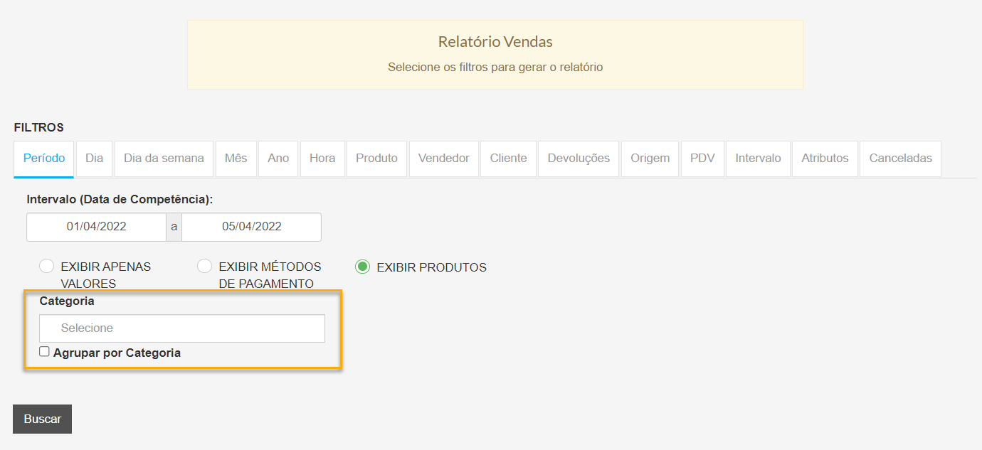 FILTRO DE CATEGORIA DE PRODUTOS NOS RELATÓRIOS DE VENDAS E COMPRAS.