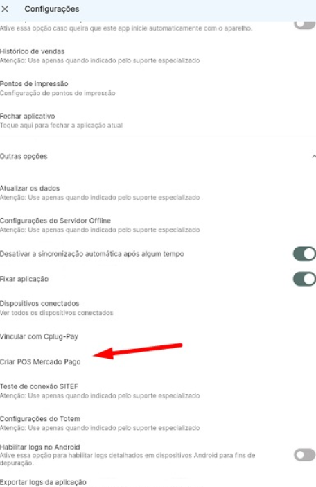 Em seguida, sincronize e habilite Criar Pos Mercado Pago na área ADM do Totem V2 ->