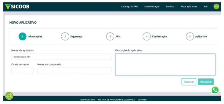 Caminho da tela abaixo: Portal Developers SICOOB>Novo Aplicativo>Informações