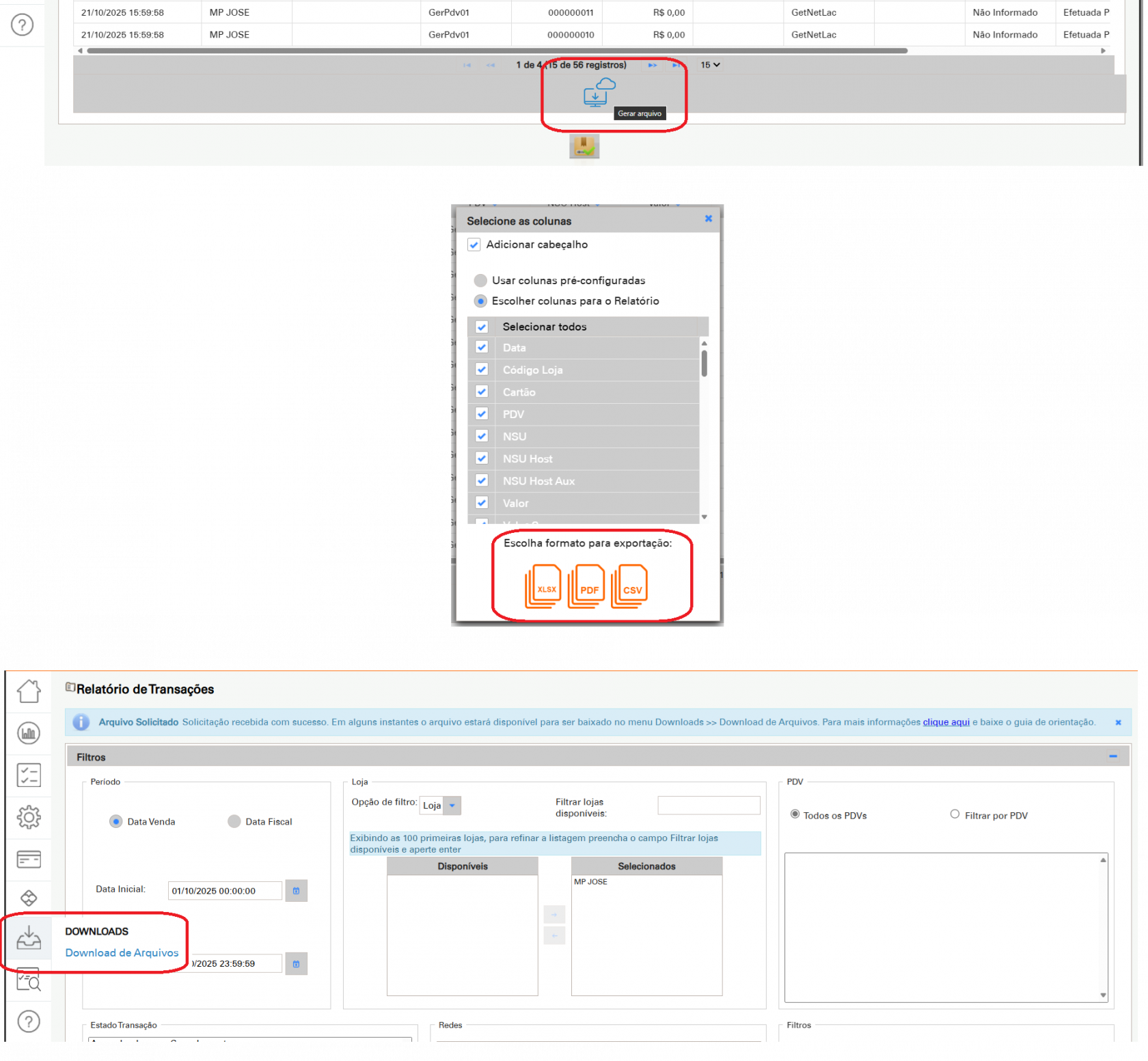 ◦ Para baixar os dados, clique em Gerar Arquivo, selecione as colunas desejadas e o formato (ex: PDF ou .TXT).