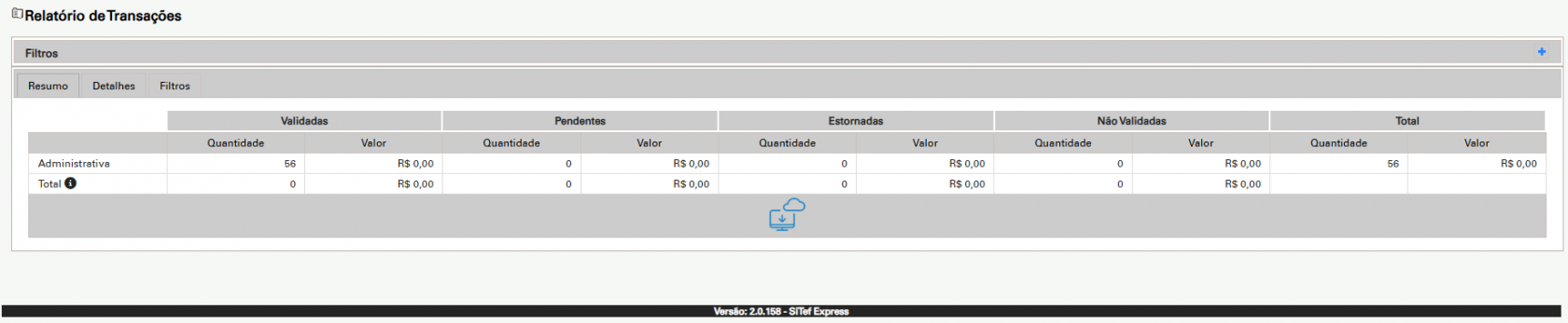 ◦ A tela exibirá o Resumo dos Quantitativos, mostrando o número e valor de transações validadas, pendentes e não validadas.