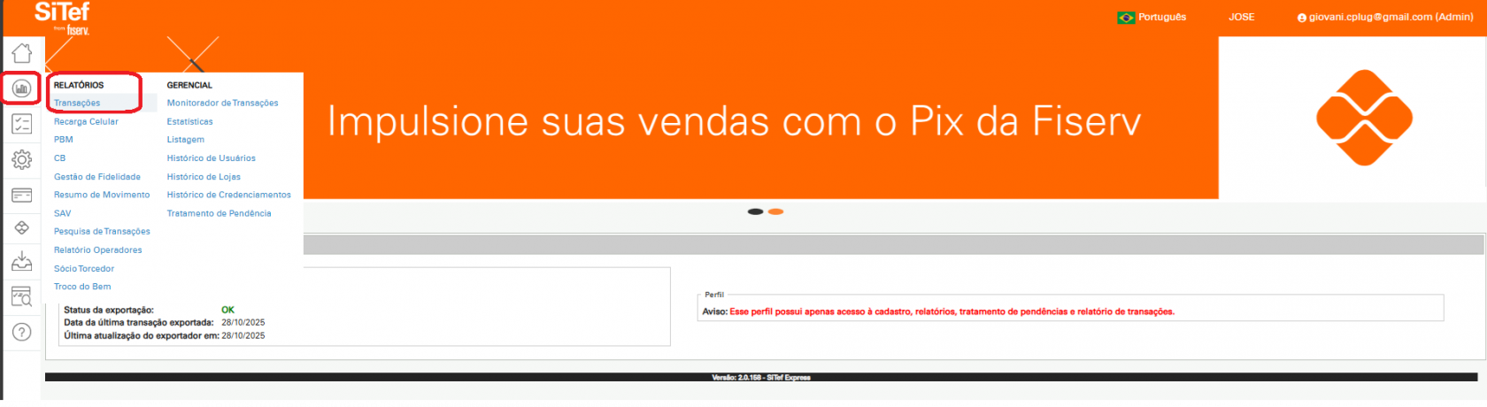- O cliente deve ter recebido as credenciais de acesso (e-mail, nome e senha) no momento do credenciamento TEF/PIX, que são enviadas pela própria Fiserv, permitindo o login no portal.