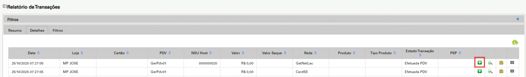 ◦ Analise o campo Código estado e resposta para identificar a causa de erros (ex: "negada pela adquirente", "senha incorreta").