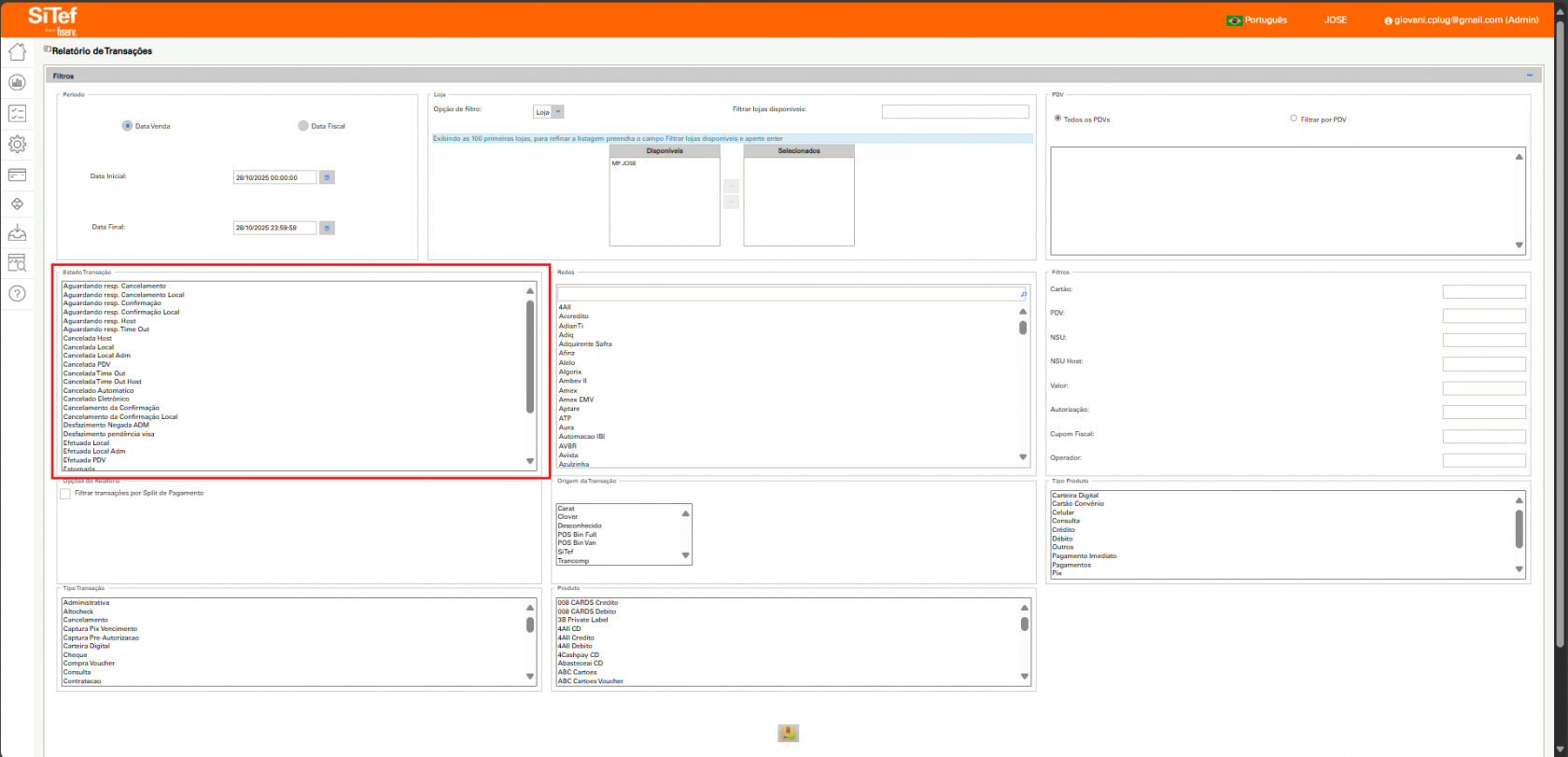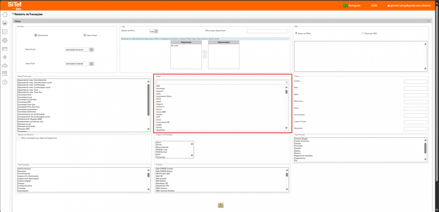 ◦ Para clientes multiadquirentes, utilize o campo Redes para filtrar a transação por adquirente específica (ex: Cielo, Stone).