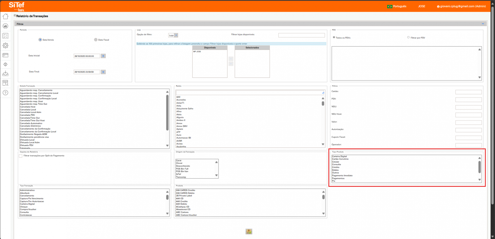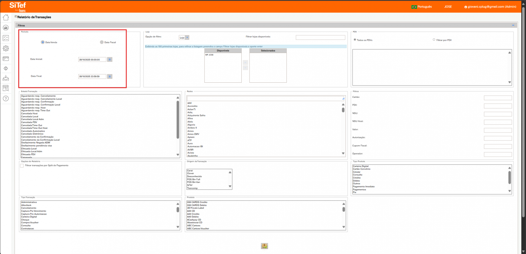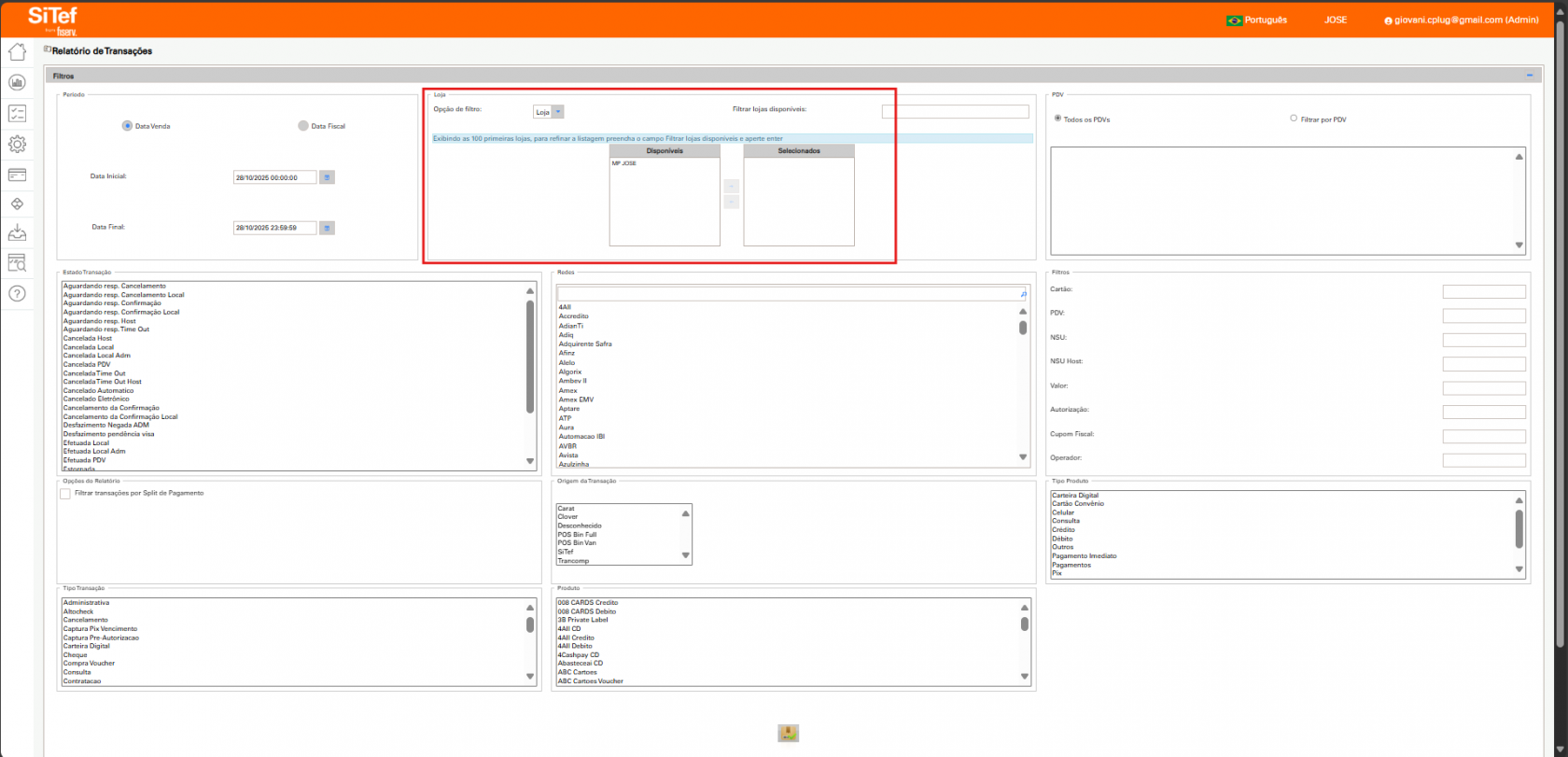 ◦ Filtro por Loja (Cenário Multi-Loja): Se o cliente possui múltiplos estabelecimentos (franquia), utilize o filtro Loja para refinar a busca, pois ele atuará como um filtro macro.
