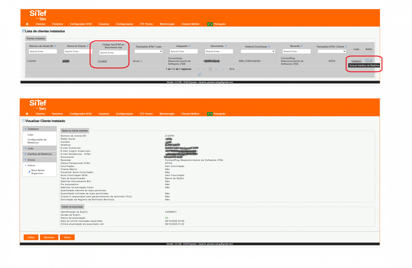 ▪ Localize o cliente e, no menu Ações, clique em Acessar Interface de Relatórios.