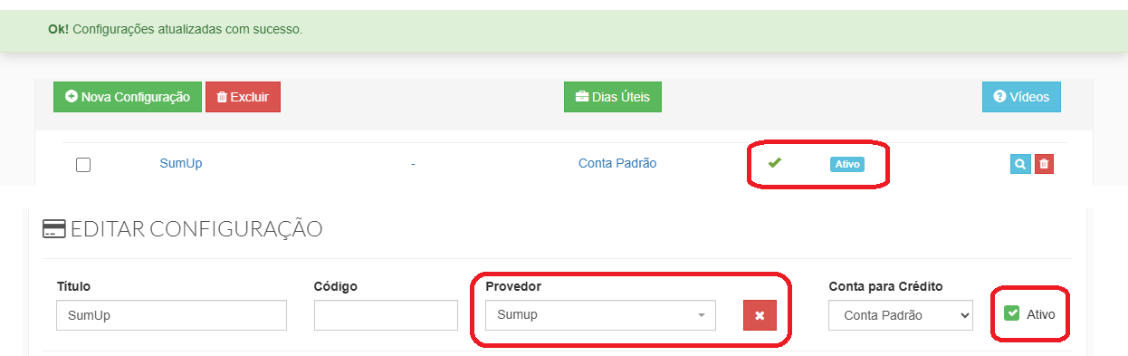 Após isso, será novamente direcionado a Configuração de Contrato de Cartões em nosso ERP com o respectivo contrato de cartões ativo, para validar se a integração está ativa, valide se na frente do Provedor de Contrato de Cartões consta a SumUp e o botão X (este botão será utilizado para excluir ou desativar a integração)